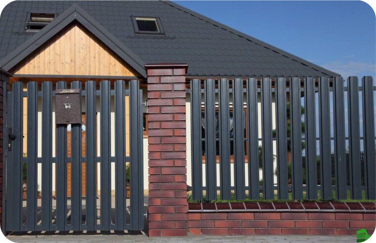 Забор из евроштакетник горизонтальный шахматкой на кирпичных столбах