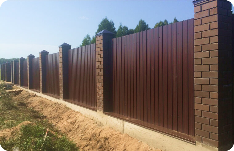Забор из евроштакетник шахматка на кирпичных столбах и ленточном фундаменте